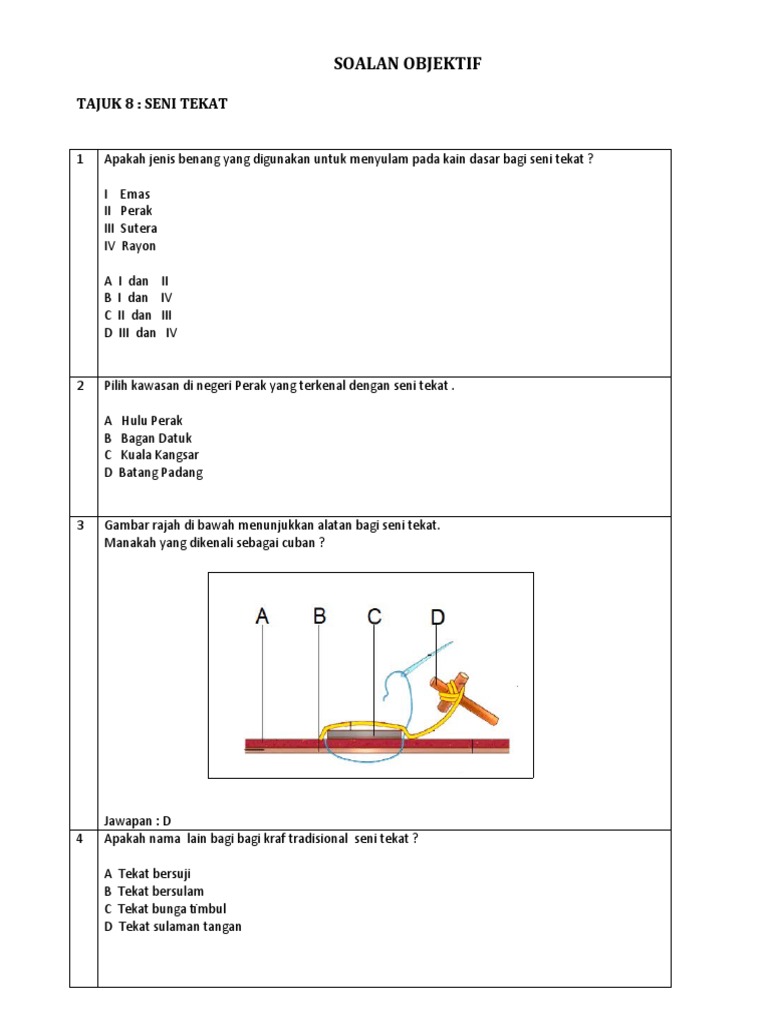 811 Menjelaskan prinsip asas seni tekat. A India dan Cina b Pakistan c Arab d Malaysia dan China 2 Pilih antara berikut yang manakah salah berkenaan dengan jenis seni tekat. Persepsi seni 92 dalam bidang pendidikan seni visual.